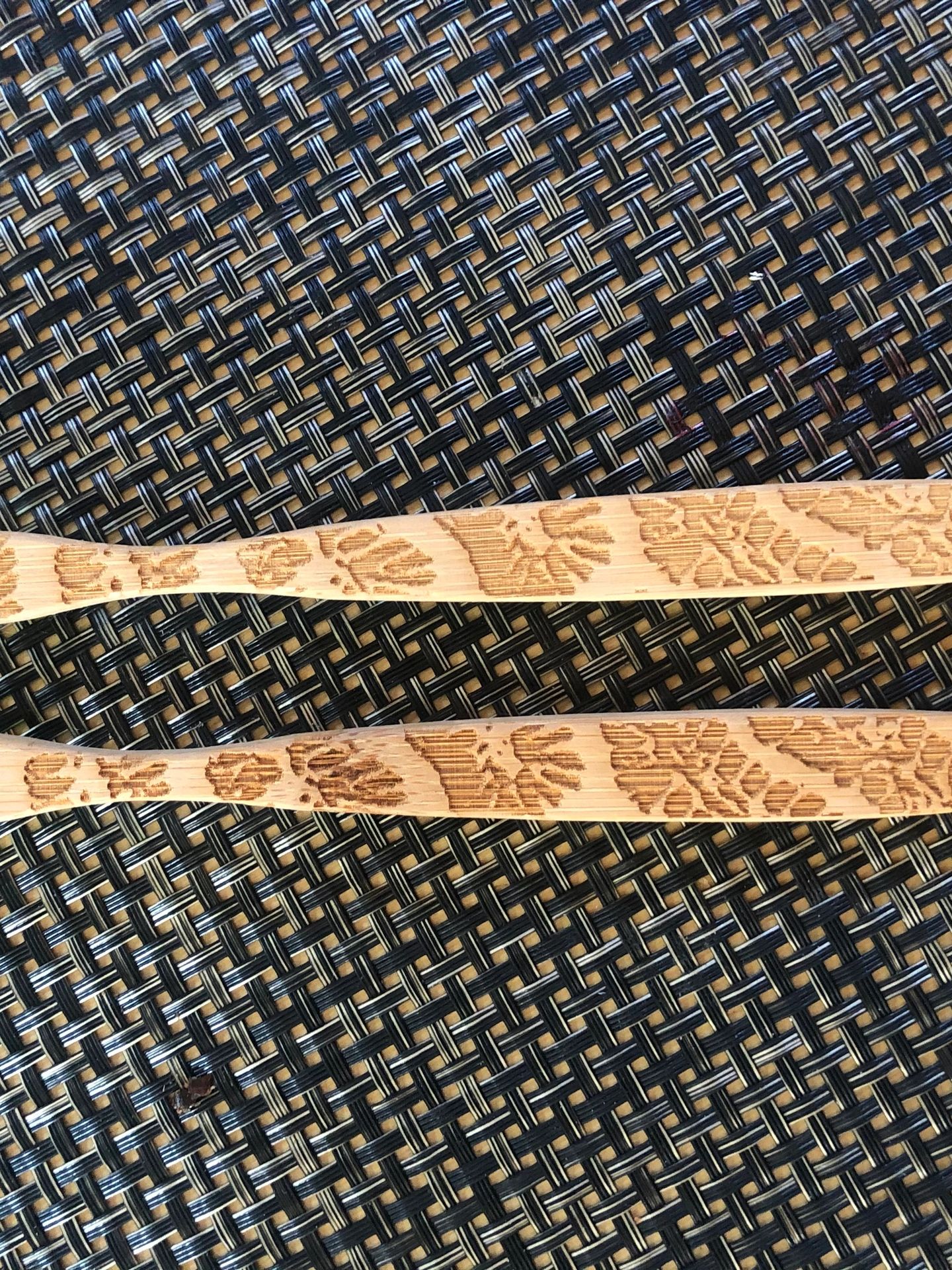 We laser-engrave these patterns in-house using close-up images of coral exoskeletons. The color differences are due to the naturally occurring tonal variations in bamboo. Most are in a honey, golden amber range.