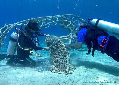 Federico Kessler and Mariana Camolesi, fabulous Zoaistas shown here, were on their way out to scrub unwanted algae off of Zoe - A Living Sea Sculpture with old plastic toothbrushes that are sanitized to keep the corals safe from disease.